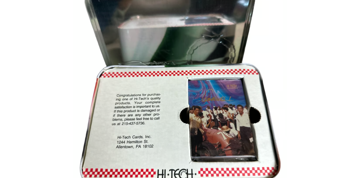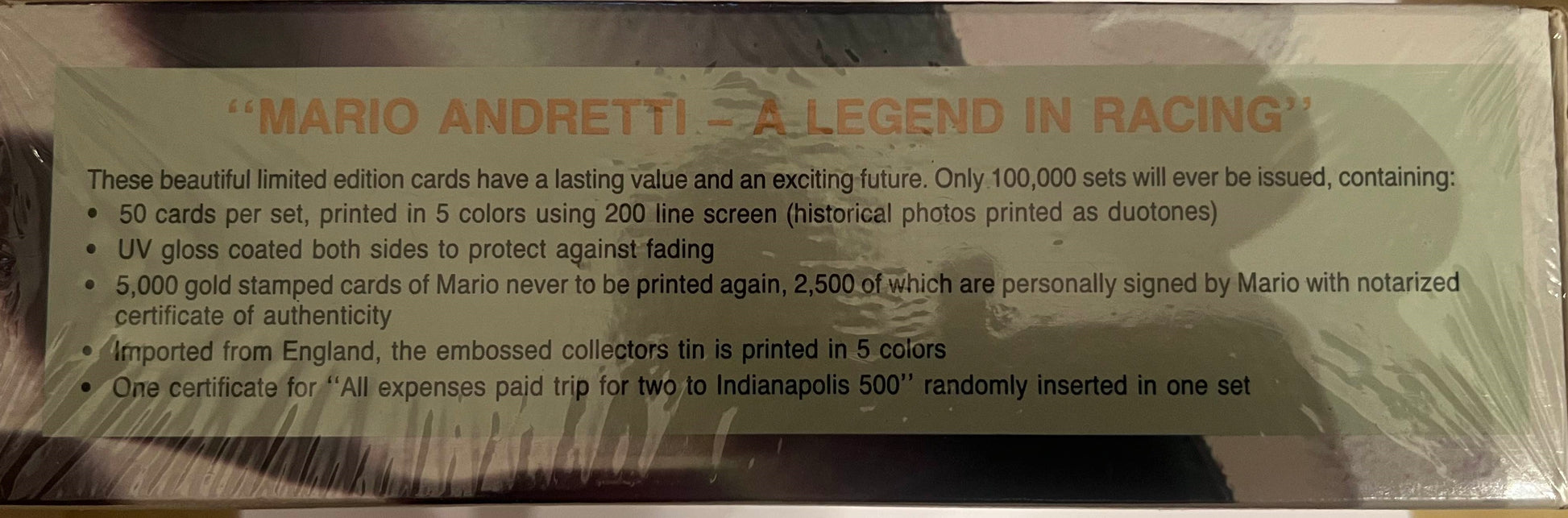 Vintage Sealed 1992 Hi-Tech MARIO ANDRETTI A Legend In Racing 50 Card Set. This vintage 1992 Hi-Tech Mario Andretti trading card set is a must-have for any auto racing fan. Featuring 50 cards, each card showcases a different aspect of Andretti's impressive career. The set is sealed and in its original packaging, making it a rare find for collectors. The tin box comes inside a cardboard box. The cards are in English and were manufactured by Hi-Tech Cards in the United Kingdom. The set includes information about Andretti's achievements, such as his win at the 1978 World Championship of Auto Racing. This sports trading card set is an excellent addition to any collection and is sure to impress any fan of auto racing. You might also even get an autographed card that was randomly inserted /2500.