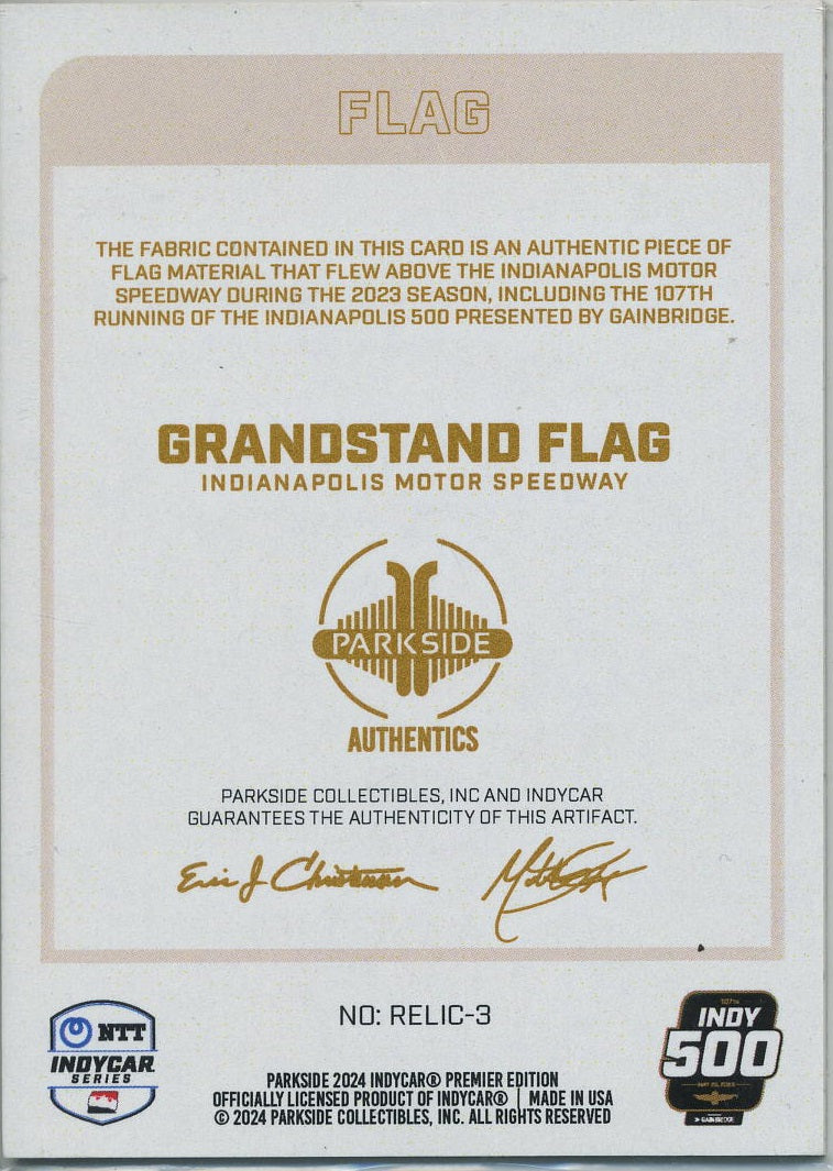 2024 Grandstand Flag Card from the Inaugural Parkside IndyCar set. These relic cards are hard to come by. Dont miss out on an opportunity to own a piece of IndyCar memorabilia!