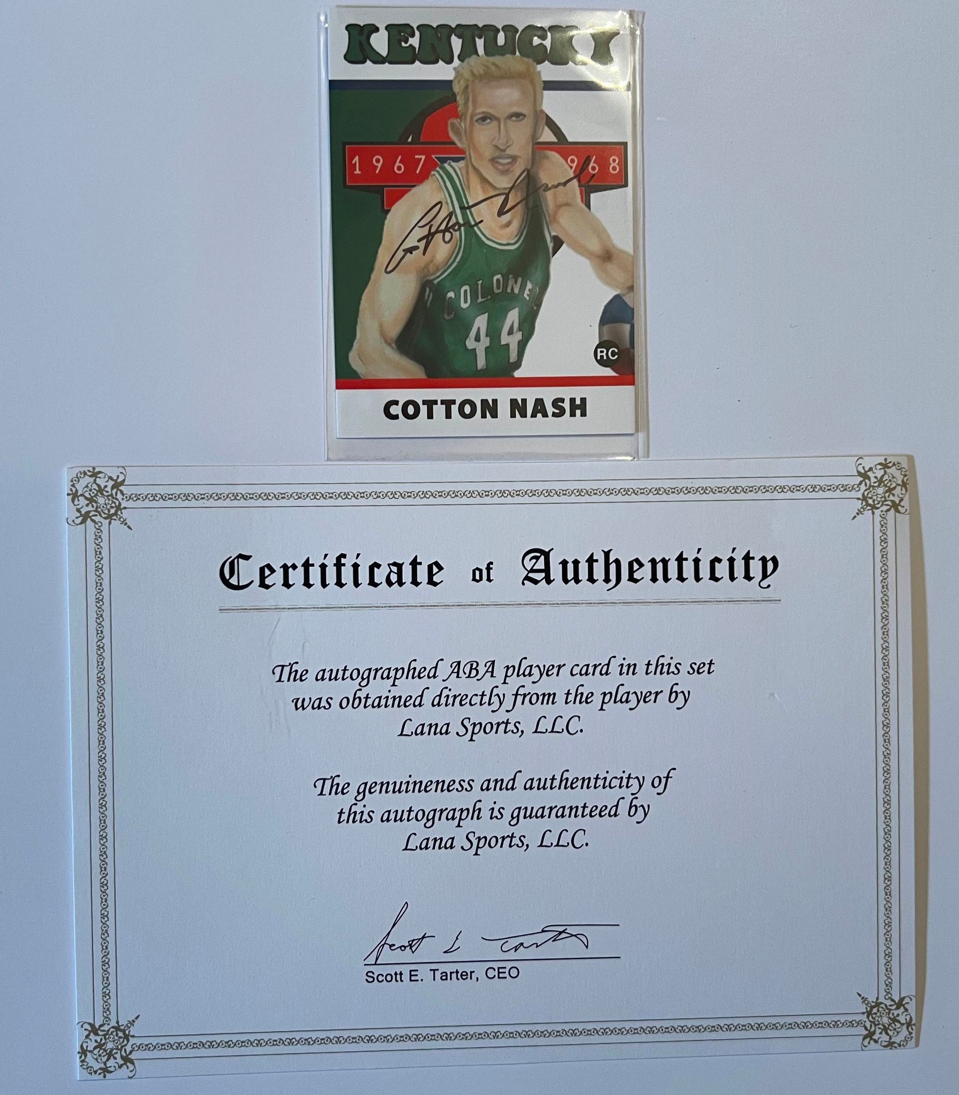 Cotton Nash Autographed Lana Sports ABA Rookie Card. Comes with COA. Only 750 sets were produced. Only 14 ABA Autographed Player variation cards were produced. This is from the 2019 Limited Edition of 750 numbered sets. Very limited qunatity of each autographed player card.