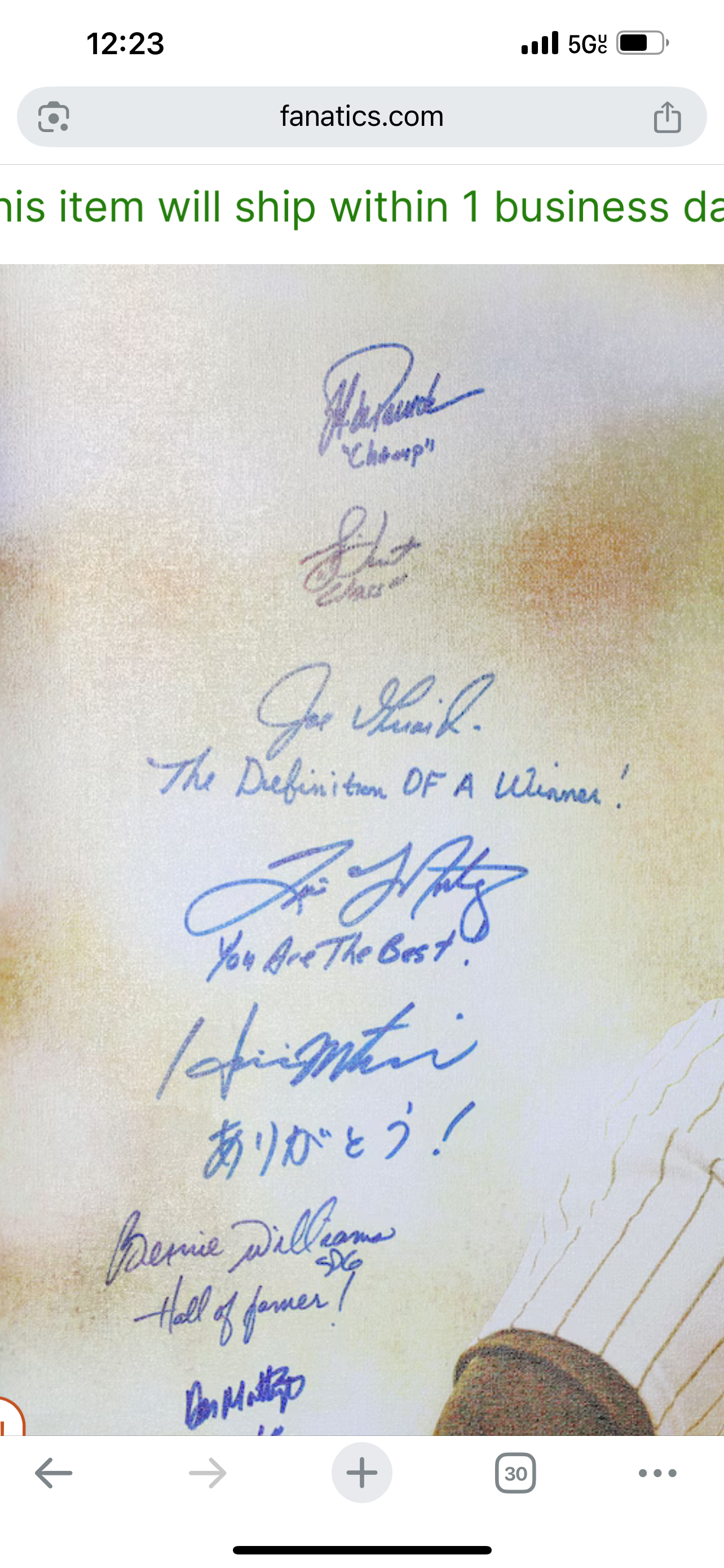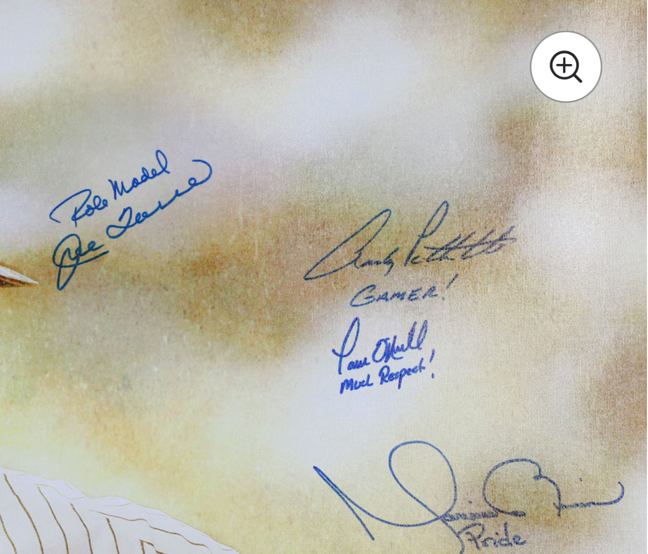 This 30" x 38" canvas has been personally hand-signed by Joe Girardi, Tino Martinez, Hideki Matsui, Andy Pettitte, Joe Torre, Bernie Williams, Paul O'Neill, Mariano Rivera, Jorge Posada, Bucky Dent, Don Mattingly with the inscriptions "CHAMP, CLASS, THE DEFINITION OF A WINNER, YOU ARE THE BEST!, HALL OF FAMER, RESPECT, ROLE MODEL, GAMER, MUCH RESPECT, PRIDE." It has been obtained under the auspices of the MLB Authentication Program and can be verified by its numbered hologram at MLB.com. It also comes with an individually numbered, tamper-evident hologram from Steiner Sports. To ensure authenticity, the hologram can be reviewed online. This process helps to ensure that the product purchased is authentic and eliminates any possibility of duplication or fraud.