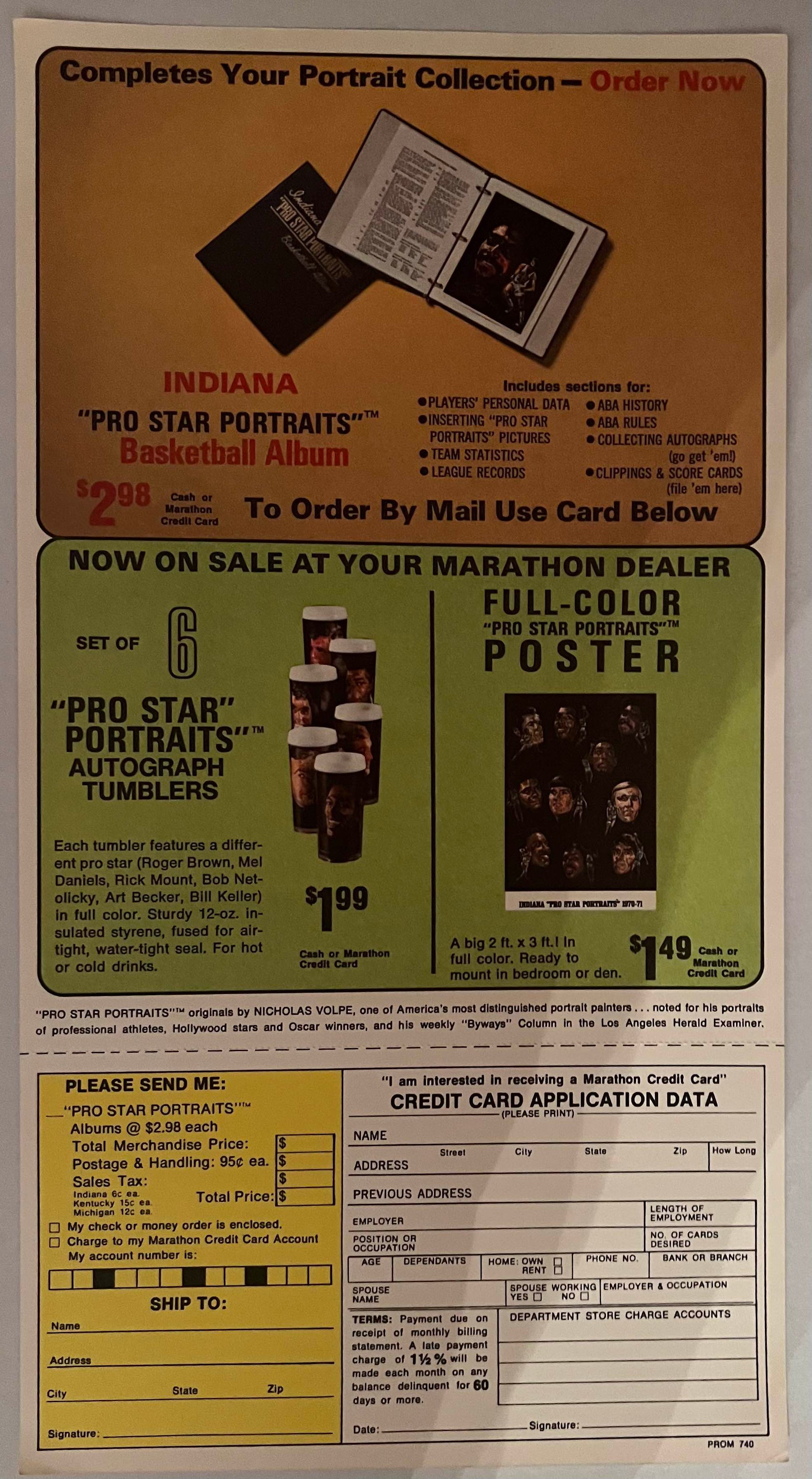 Freddie Lewis a member of the Pacers’ first ABA championship team in 1970 this basketball card which are part of a set were sponsored by Marathon Oil and drawn by prolific professional sports artist Nicholas Volpe. The reverse sides are completely filled with advertising and promotional opportunities to buy. This is from the 1970-1971 season. Freddie is the only player to start his career in the NBA, and play all 9 full ABA seasons (1967–1976) until the NBA/ABA merger, then sign back with the NBA.