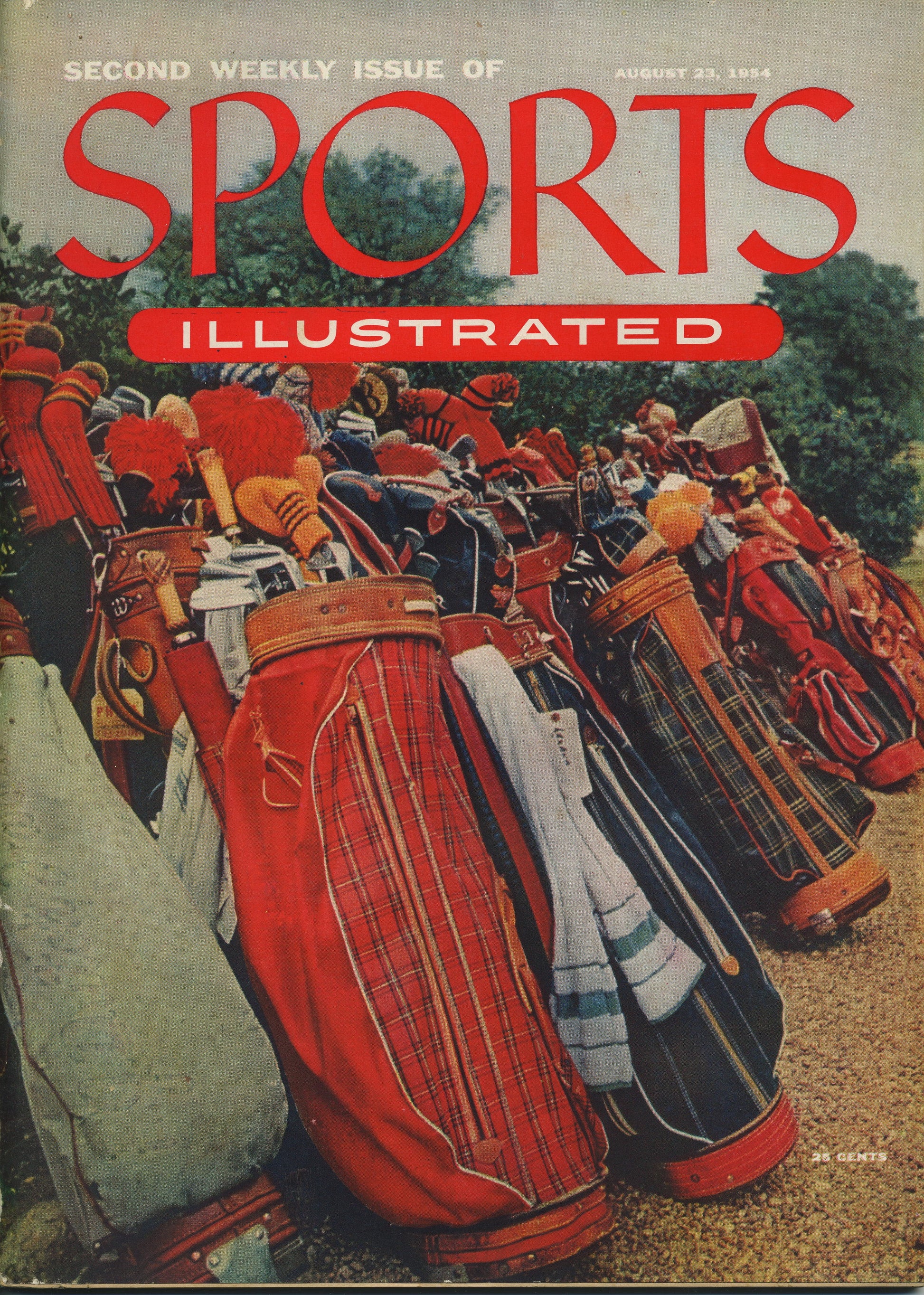 The front cover features a color photograph of “Golf Bags at the Masters” by Mark Kauffman. Includes a three page fold-out spread of Baseball Trading Cards, 27 in total. A bright, near fine example, solid binding.