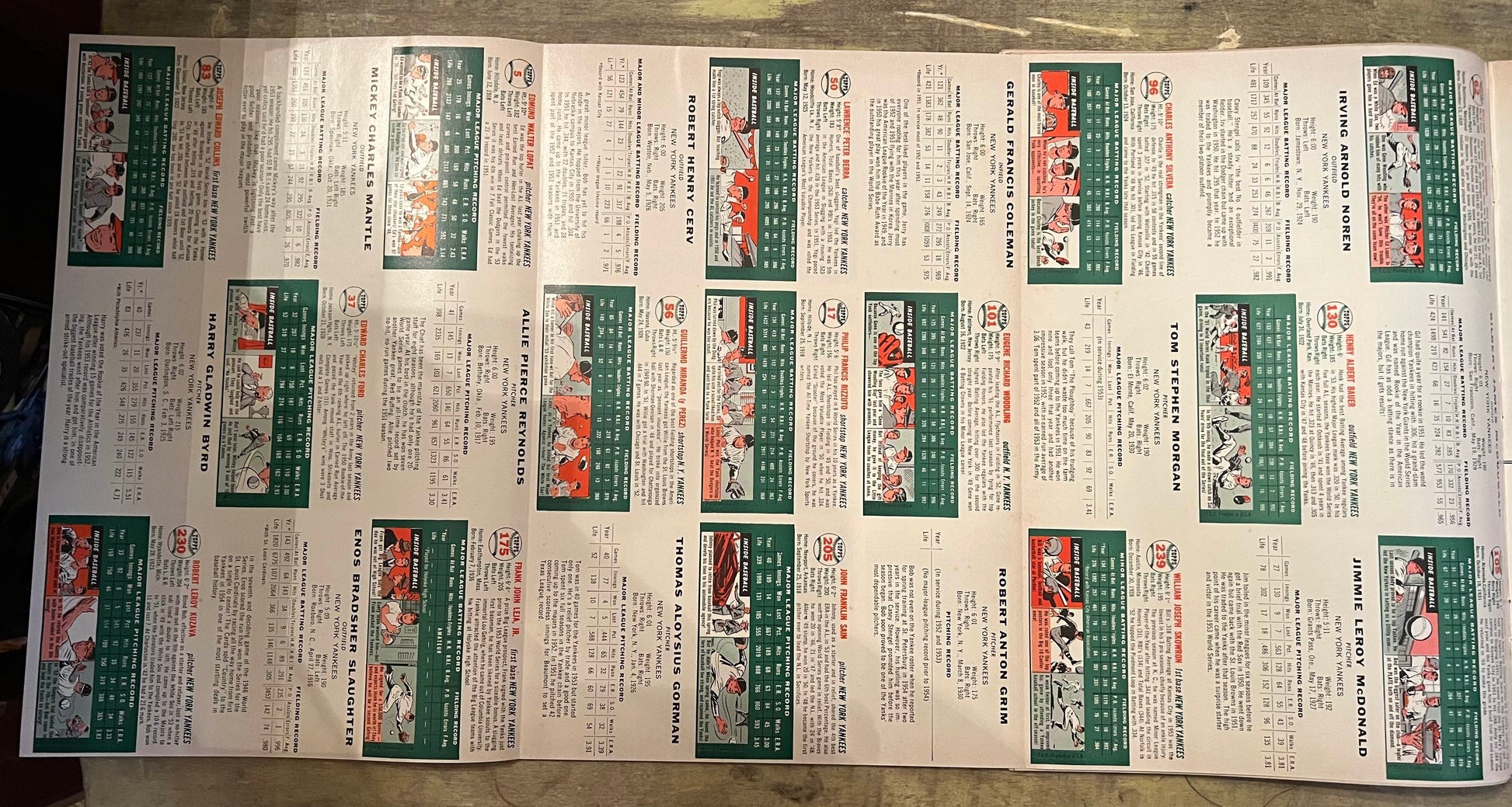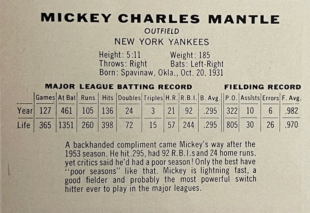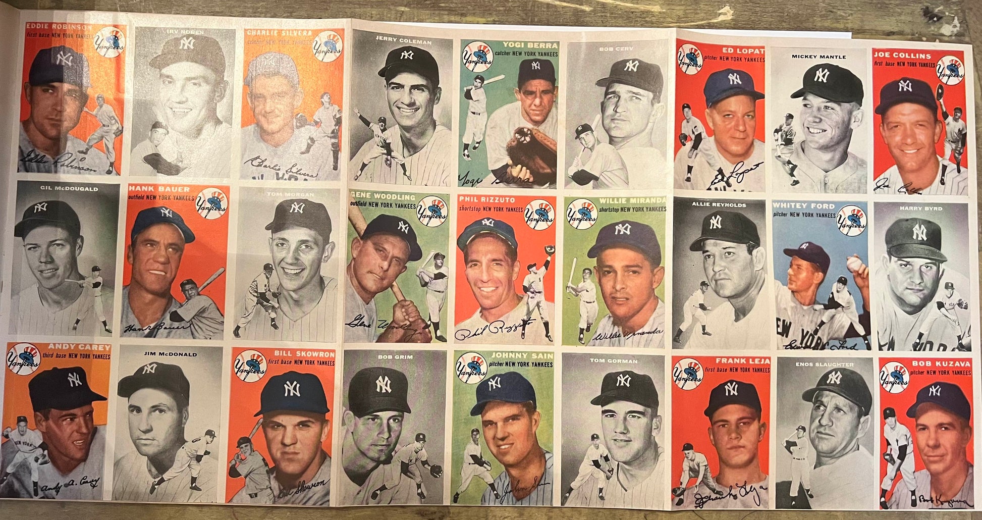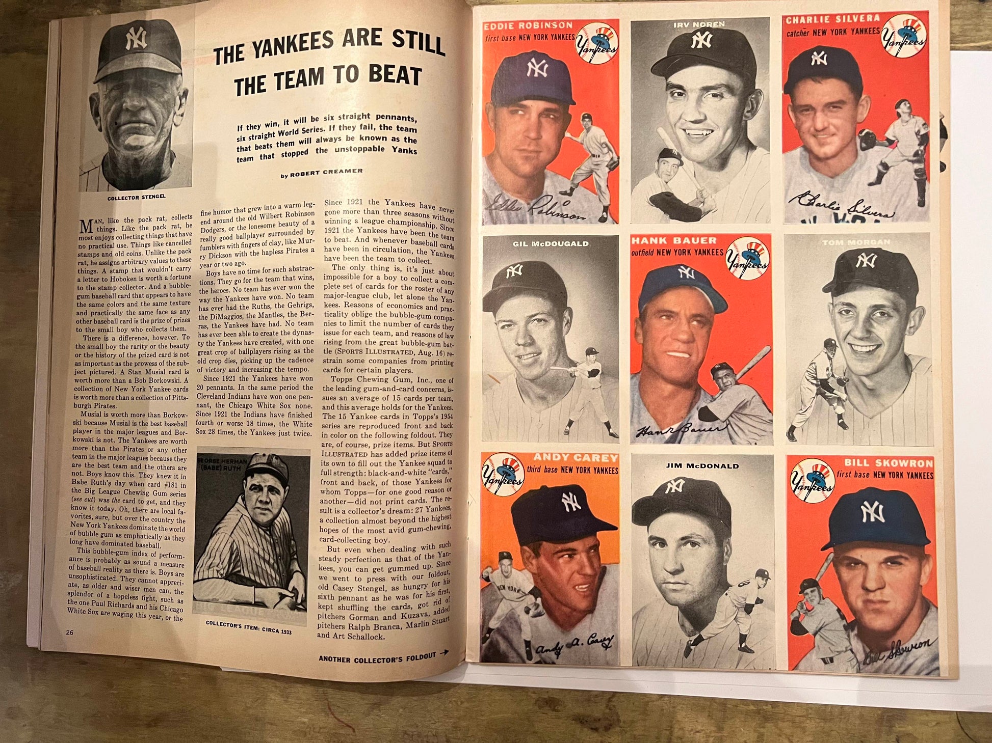 Topps Chewing Gum, Inc., one of the leading gum-and-card concerns, issues an average of 15 cards per team, and this average holds for the Yankees. The 15 Yankee cards in Topps’s 1954 series are reproduced front and back on color on the following foldout. They are, of course, prize items. But SPORTS ILLUSTRATED has added prize items of its own to fill out the Yankee squad to full strength: black-and-white “cards,” front and back, of those Yankees for whom Topps – for one good reason or another – did not print cards. The result is a collector’s dream: 27 Yankees, a collection almost beyond the highest hopes of the most avid gum-chewing, card-collecting boy.”